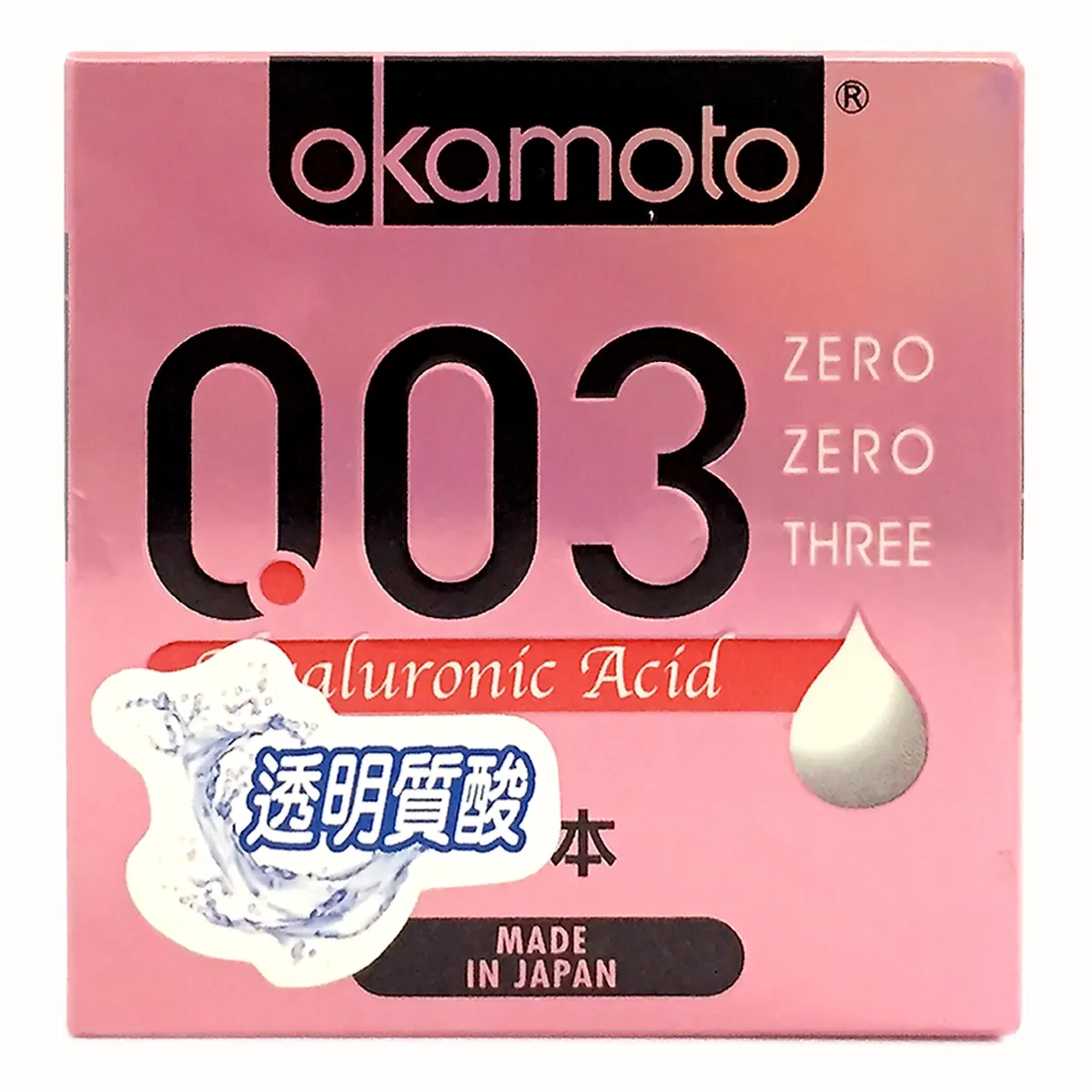 Bao cao su siêu mỏng, dưỡng ẩm Okamoto 0.03 Hyaluronic Acid hộp 3 cái
