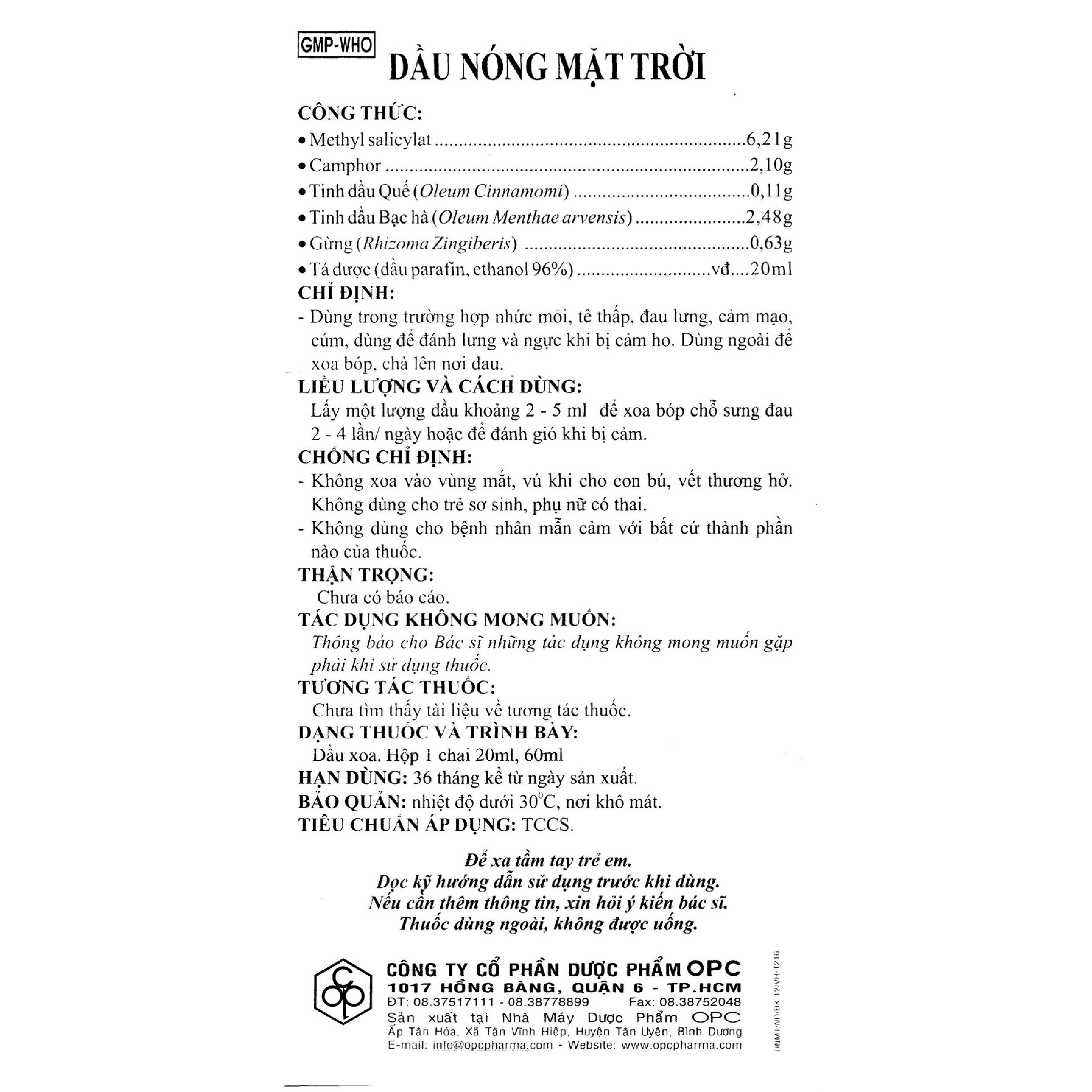 Hoạt chất: Methyl salicylat 6,21g, Camphor 2,10g, Tinh dầu Quế (Oleum Cinnamomi) 0,11g, Tinh dầu Bạc hà (Oleum Menthae arvensis) 2,48g, Gừng (Rhizoma Zingiberis) 0,63g Tá dược: dầu parafin, ethanol 96% vừa đủ 20ml