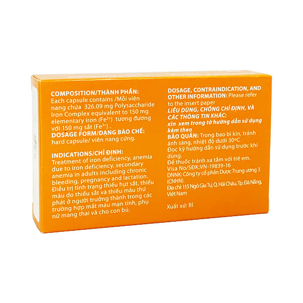 Mỗi viên có chứa: Hoạt chất: Polysaccharide Iron Complex 326.09 mg tương đương với 150 mg sắt (Fe3+). Tá dược: tinh bột mì, magnesi stearat Vỏ nang: sắt đỏ oxit (E172), titan dioxit (E171), gelatin.