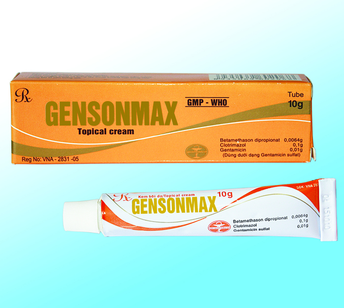 Thuốc kem bôi ngoài da Gensonmax là sự phối hợp hiệp đồng tác dụng kháng viêm chống dị ứng của Betamethason, tác dụng chống nấm của Clotrimazol và tác dụng diệt khuẩn của Gentamicin trong một sản phẩm. - Betamethason là một corticosteroid tổng hợp, có tác dụng của nhóm Glucocorticoid rất mạnh trên các tác dụng kháng viêm, chống thấp khớp và chống dị ứng. Dạng este dipropionat dùng ngoài da làm ngăn cản sự hấp thu qua da, kéo dài và tăng tác dụng kháng viêm tại chỗ của Betamethason. - Clotrimazol là thuốc chống nấm phổ rộng, cơ chế tác dụng của Clotrimazol là liên kết với các phospholipid trong màng tế bào nấm, làm thay đổi tính thấm của màng gây mất các chất thiết yếu nội bào dẫn đến tiêu hủy tế bào nấm. Clotrimazol được dùng để điều trị các trường hợp bệnh ngoài da do nhiễm các loài nấm gây bệnh khác nhau và cũng có tác dụng trên Trichomonas, Staphylococcus, Bacteroides. - Gentamicin là kháng sinh thuộc nhóm aminoglycosid, có tác dụng diệt khuẩn bằng cách ức chế quá trình sinh tổng hợp protein của vi khuẩn, có hoạt tính trên nhiều loại vi khuẩn gây bệnh bao gồm các vi khuẩn hiếu khí gram âm và các tụ cầu khuẩn, kể cả các chủng tạo ra penicilinase và kháng methicilin. Gentamicin có tác dụng với H.influenzae, Shigella flexneri, tụ cầu vàng, S.epidermidis, đặc biệt Staphylococcus saprophyticus, Salmonella typhi, E.coli.