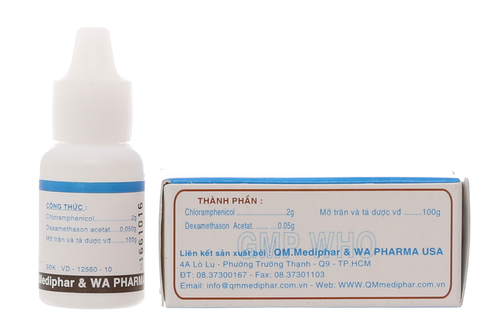 - Chloramphenicol 2g. - Dexamethason acetat 0.050g. - Mỡ trăn và tá dược vừa đủ 100g.