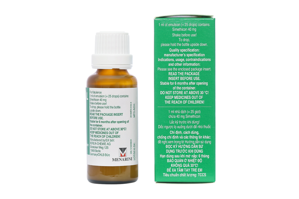 Hoạt chất: Simethicon. 25 giọt. (1 ml nhũ dịch uống) chứa 40 mg simethicon. Các tá dược khác: Macrogol stearate 40, Glycerol monostearate 40-55, carbomer, hương chuối, acesulfam potassium, sorbitol liquid 70 % (non crystallising) (Ph. Eur.), sodium chloride, sodium citrate, sodium hydroxide, sorbic acid (Ph. Eur.), nước cất.