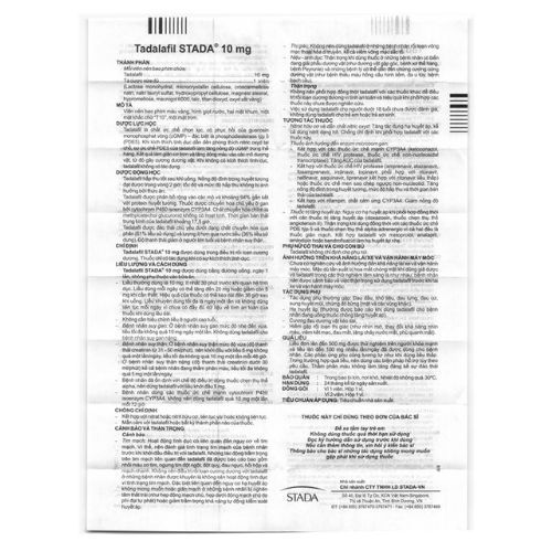 Tadalafil STADA 10 mg được dùng bằng đường uống và không phụ thuộc vào bữa ăn. - Liều thường dùng là 10 mg, ít nhất 30 phút trước khi quan hệ tình dục. Liều dùng mỗi ngày có thể tăng đến 20 mg hoặc giảm còn 5 mg khi cần thiết. Hiệu quả của thuốc có thể kéo dài đến 36 giờ sau khi uống. - Số lần sử dụng khuyên dùng tối đa là ngày một lần và không dùng liên tục mỗi ngày vì chưa có đầy đủ dữ liệu về tính an toàn của thuốc khi dùng lâu dài. ~. Không cần hiệu chỉnh liều ở người lớn tuổi. - Bệnh nhân suy gan: Ở bệnh nhân suy gan mức độ nhẹ đến vừa, liều tối đa không quá 10 mg ngày một lần. Không dùng tadalafil cho bệnh nhân suy gan nặng. - Bệnh nhân suy thận: Ở bệnh nhân suy thận mức độ vừa (độ thanh thải creatinin từ 31- 50 ml/phút), nên khởi đầu với liều 5 mg không quá một lần/ ngày, liều tối đa không quá 10 mg một lần mỗi 48 giờ. Ở bệnh nhân suy thận nặng (độ thanh thải creatinin dưới 30 ml/phút) và bệnh nhân đang thẩm phân máu, liều tối đa không quá 5 mg một lần mỗi ngày. - Bệnh nhân đã ổn định với chế độ điều trị dùng thuốc chẹn thụ thể alpha, nên dùng tadalafil với liều khởi đầu 5 mg. - Bệnh nhân dùng các thuốc ức chế mạnh cytochrom P450 isoenzym CYP3A4, không nên dùng tadalafil quá 10 mg một lần mỗi 72 giờ.