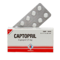 - Captopril là chất ức chế enzym chuyển dạng angiotensin I, được dùng trong điều trị tăng huyết áp, và suy tim. Tác dụng hạ huyết áp của thuốc liên quan đến ức chế hệ renin - angiotensin - aldosteron. Renin là enzym do thận sản xuất, khi vào máu tác dụng trên cơ chất globulin huyết tương sản xuất ra angiotensin I, là chất decapeptid có ít hoạt tính. Nhờ vai trò của enzym chuyển dạng (ACE), angiotensin I chuyển thành angiotensin II. Chất sau làm co mạch nội sinh rất mạnh, đồng thời lại kích thích vỏ thượng thận tiết aldosteron, có tác dụng giữ natri và nước. Captopril ngăn chặn được sự hình thành angiotensin II. - Tác dụng chống tăng huyết áp: Captopril làm giảm sức cản động mạch ngoại vi, thuốc không tác động lên cung lượng tim. Tưới máu thận được duy trì hoặc tăng. Mức lọc cầu thận thường không thay đổi. Nếu có hạ nhanh huyết áp ở người bệnh tăng huyết áp kéo dài hoặc huyết áp rất cao thì mức lọc cầu thận có thể giảm nhất thời, thể hiện ở sự tăng creatinin huyết thanh. Tác dụng hạ huyết áp xảy ra trong khoảng 60 - 90 phút sau khi uống liều thứ nhất. Thời gian tác dụng phụ thuộc vào liều: Sau một liều bình thường, tác dụng thường duy trì ít nhất 12 giờ. Trong điều trị tăng huyết áp, đáp ứng điều trị tối đa đạt được sau 4 tuần điều trị. Giảm phì đại thất trái đạt được sau 2 - 3 tháng dùng captopril. Tác dụng hạ huyết áp không phụ thuộc vào tư thế đứng hay nằm. Hạ huyết áp tư thế (hạ huyết áp thế đứng) thường ít gặp, nhưng có thể xảy ra, đặc biệt ở người có thể tích máu giảm. - Điều trị suy tim: Captopril có tác dụng tốt chống tăng sản cơ tim do ức chế hình thành angiotensin II, là chất kích thích tăng trưởng quan trọng của cơ tim. Đối với người bệnh suy tim, captopril làm giảm tiền gánh, giảm sức cản ngoại vi, tăng cung lượng tim và vì vậy làm tăng khả năng làm việc của tim. Tác dụng huyết động và lâm sàng thường xảy ra nhanh và duy trì trong khi điều trị. Cải thiện lâm sàng thấy cả ở người bệnh có tác dụng huyết động kém. Tưới máu thận có thể tăng nhanh tới 60%, tác dụng này thường đạt được từ 60 - 90 phút sau khi uống một liều và đạt tác dụng tối đa sau 3 - 8 giờ, duy trì trong khoảng 12 giờ. Có thể phối hợp captopril với digitalis và các thuốc lợi tiểu. Không nên phối hợp với các thuốc lợi tiểu giữ kali như spironolacton vì có thể dẫn đến tăng kali máu nặng. - Điều trị nhồi máu cơ tim: Lợi ích của các chất ức chế ACE là làm giảm tỷ lệ tái phát nhồi máu cơ tim, có thể do làm chậm tiến triển xơ vữa động mạch. Captopril làm giảm tỷ lệ chết sau nhồi máu cơ tim. Nên dùng thuốc sớm trong cơn nhồi máu cơ tim cấp tính cho mọi người bệnh, ngay cả khi có dấu hiệu nhất thời rối loạn chức năng thất trái.