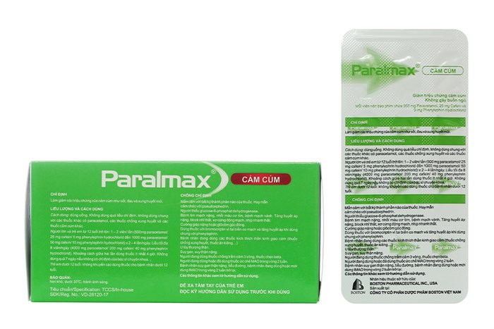 Paracetamol: - Ít gặp: ban da, buồn nôn, nôn, rối loạn tạo máu (giảm bạch cầu trung tính, giảm toàn thể huyết cầu, giảm bạch cầu), thiếu máu, bệnh thận (độc tính thận khi sử dụng dài ngày). - Hiếm gặp: phản ứng quá mẫn. Đôi khi có các phản ứng phụ trên da măc dù tỉ lệ mắc phải là không cao nhưng nghiêm trọng, thậm chí đe dọa tính mạng bao gồm hội chứng Steven- Johnson (SJS), hội chứng hoại tử da nhiễm độc: toxic epidermal necrolysis (TEN) hay hội chứng Lyell, hội chứng ngoại ban mụn mủ toàn thân cấp tính: acute generalized exanthematous pustulosis (AGEP). Phenylephrin hydrochlorid: - Thường gặp: kích động thần kinh, bồn chồn, lo âu, khó ngủ, người yếu mệt, choáng váng, đau trước ngực, run rẩy, dị cảm đầu chi, tăng huyết áp, da nhợt nhạt, trắng bệch, cảm giác lạnh da, dựng lông, tóc, kích ứng tại chỗ. - Ít gặp: tăng huyêt áp kèm phù phổi, loạn nhịp tim, nhịp tim chậm, co mạch ngoại vi và nội tạng làm giảm tưới máu cho các cơ quan này, suy hô hấp, cơn hưng phấn, ảo giác, hoang tưởng, giải phóng hạt sắc tố ở mống mắt làm mờ giác mạc. - Hiếm gặp: viêm cơ tim thành ổ, xuất huyêt dưới màng ngoài tim. Cafein: Bồn chồn, chóng mặt. Khi sử dụng thuốc cùng với chế độ ăn uống giàu cafein có thể dẫn đến quá liều cafein: mất ngủ, thao thức, lo lắng, cáu kỉnh, đau đâu, rối loạn tiêu hóa, hồi hộp. Thông báo cho bác sĩ những tác dụng không mong muốn gặp phải khi sử dụng thuốc.
