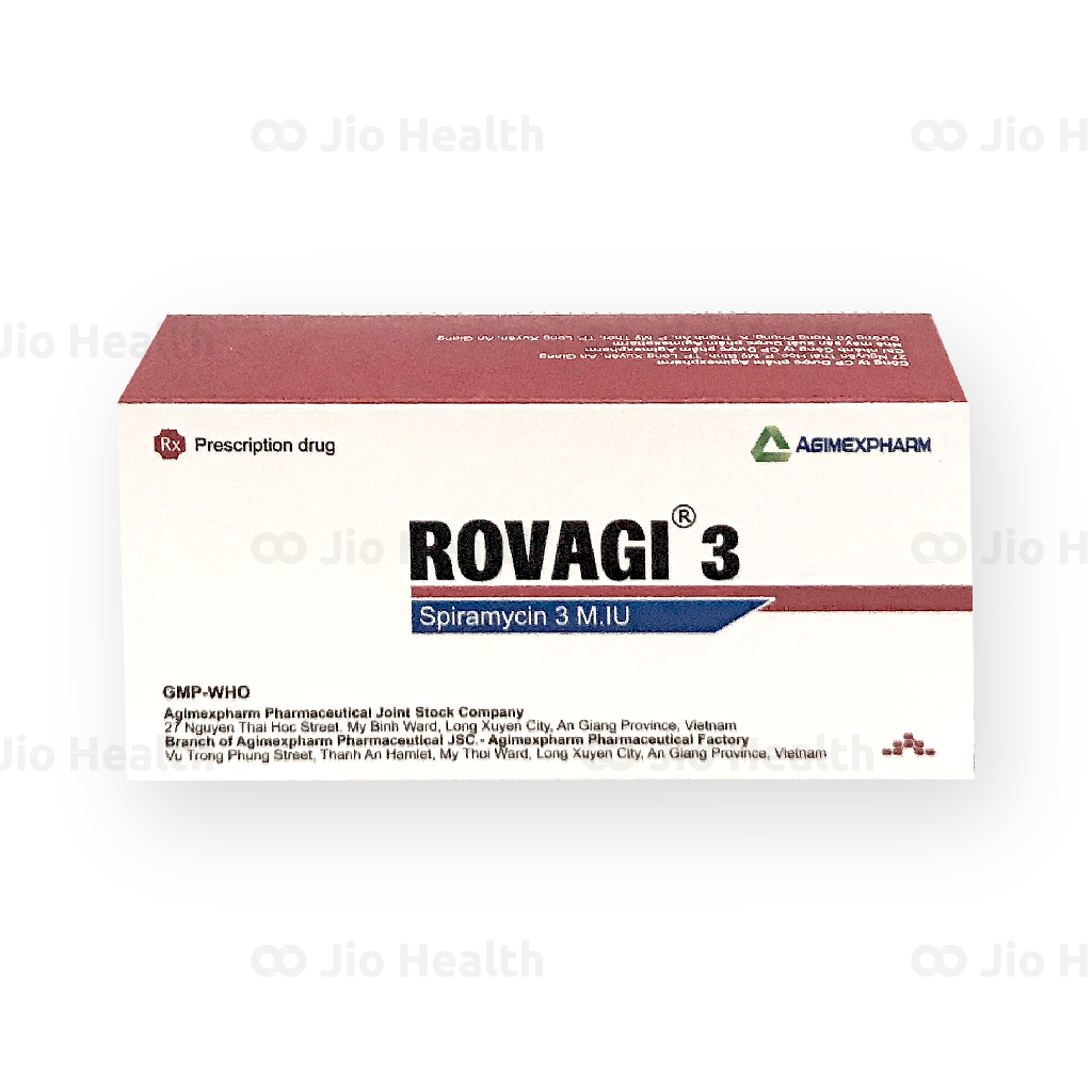 Uống thuốc trước bữa ăn ít nhất 2 giờ hoặc sau bữa ăn 3 giờ. Người bệnh phải uống thuốc theo hết đợt điều trị. - Điều trị nhiễm khuẩn do các vi khuẩn nhạy cảm với spiramycin: + Người lớn: uống 1,5 đến 3 M.IU/lần X 2 - 3 lần/ngày. - Điều trị dự phòng viêm màng não do các chủng Meningococcus. + Người lớn: 3 M.IU/lần X 2 lần/ngày (khoảng cách giữa 2 lần là 12 giờ) X 5 ngày. - Dự phòng nhiễm Toxoplasma bẩm sinh trong thời kỳ mang thai: 9 M.IU/ngày, chia làm nhiều lần uống trong 3 tuần, cứ cách 2 tuần lại cho liều nhắc lại. * Viên Rovagi 3 M.IU không thích hợp dùng cho trẻ em.