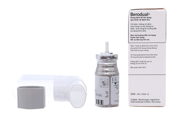 Nên điều chỉnh liều dùng theo yêu cầu của từng bệnh nhân. Ngoại trừ kê đơn khác, những liều sau đây được khuyến cáo cho bệnh nhân người lớn và trẻ trên 6 tuổi: - Cơn hen cấp 2 nhát xịt là phù hợp để giảm nhanh triệu chứng trong nhiều trường hợp. Trong những trường hợp nặng hơn, nếu khó thở không cải thiện sau 5 phút có thể dùng thêm 2 nhát xịt nữa. Nếu cơn hen không thuyên giảm sau 4 nhát xịt thì có thể xịt thêm thuốc. Trong trường hợp này, bệnh nhân nên nhanh chóng đi khám bác sĩ hoặc đến bệnh viện gần nhất. - Điều trị ngắt quãng và kéo dài (đối với hen, Berodual bình xịt định liều chỉ nên sử dụng dựa theo nhu cầu) 1 - 2 nhát xịt cho mỗi lần dùng, tối đa 8 nhát xịt mỗi ngày (trung bình 1 - 2 nhát xịt x 3 lần/ngày). Chỉ nên dùng Berodual bình xịt định liều cho trẻ em theo chỉ định của bác sĩ và dưới sự giám sát của người lớn. Nên hướng dẫn bệnh nhân sử dụng bình xịt định liều đúng cách để đảm bảo điều trị hiệu quả (xem hướng dẫn sử dụng). Hướng dẫn sử dụng Trước khi sử dụng lần đầu tiên bình xịt định liều nên tuân thủ những nguyên tắc sau: Tháo nắp bảo vệ và ấn van bình xịt hai lần. Trước mỗi lần sử dụng bình xịt định liều nên tuân thủ các nguyên tắc sau: 1. Tháo nắp bảo vệ (Nếu không sử dụng bình xịt quá 3 ngày thì cần khởi động van một lần). 2. Thở ra hết sức. 3. Giữ bình xịt như hình 1, ngậm môi xung quanh ống ngậm. Mũi tên và đáy bình xịt hướng lên trên. 4. Hít vào tối đa, đồng thời ấn mạnh vào đáy bình xịt để giải phóng một liều chuẩn. Nín thở trong vài giây, sau đó rút ống ngậm ra khỏi miệng và thở ra. Thực hiện tương tự với liều xịt thứ hai. 5. Đậy lại nắp bảo vệ sau mỗi lần dùng. Bình xịt không trong suốt nên không thể biết khi nào hết thuốc. Bình xịt cung cấp 200 liều. Khi sử dụng hết bình xịt vẫn có thể còn chứa một lượng dịch nhỏ. Tuy nhiên nên thay bình xịt mới bởi vì bệnh nhân có thể không được nhận đúng liều điều trị. Có thể ước lượng lượng thuốc còn lại trong bình bằng cách kiểm tra như sau: - Lắc bình sẽ biết liệu còn thuốc bên trong không. - Cách khác, tháo bình xịt ra khỏi ống ngậm bằng nhựa và thả vào chậu nước, lượng thuốc còn lại trong bình có thể được ước lượng bằng cách quan sát vị trí bình xịt trong nước. Vệ sinh bình xịt ít nhất 1 lần mỗi tuần. Điều quan trọng là giữ sạch ống ngậm để đảm bảo thuốc không bị đọng lại và ngăn cản việc xịt thuốc. Để vệ sinh, trước tiên tháo nắp bảo vệ và lấy bình ra khỏi ống ngậm. Rửa ống ngậm dưới nước ấm cho đến khi không còn thuốc đọng và/hoặc sạch bụi. Lắc mạnh ống ngậm sau khi làm sạch và để tự khô không sấy. Khi ống ngậm đã khô, lắp bình xịt và nắp chống bụi. CẢNH BÁO Ống ngậm bằng nhựa được thiết kế đặc biệt để sử dụng cho Berodual bình xịt định liều đảm bảo bệnh nhân luôn nhận đúng lượng thuốc điều trị. Không được sử dụng ống ngậm với bất kỳ bình xịt định liều khác cũng như không được sử dụng Berodual với bất kỳ ống ngậm nào trừ ống ngậm được cung cấp cùng với thuốc. Bình xịt định liều có áp suất và không được cố để mở bình xịt hoặc để bình xịt tiếp xúc với nhiệt độ trên 50°C.