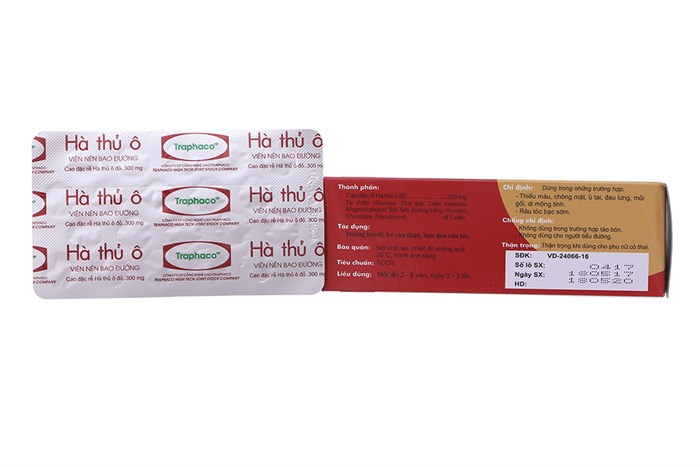 - Hoạt chất: Cao đặc rễ Hà thủ ô đỏ (Extractum Radix Fallopiae multiflorae) 300 mg (Tương đương 1,5g rễ hà thủ ô đỏ). - Tá dược: Glucose, tinh bột, calci carbonat, magnesi stearat, bột Talc, đường trắng, povidon, chocolate, titan dioxyd vừa đủ 1 viên.
